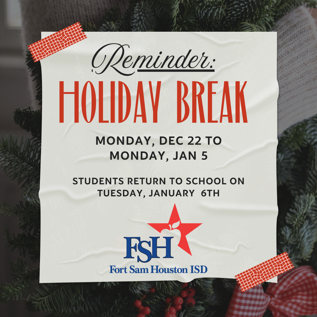 Campuses and district offices will closed on Monday, December 22nd. Staff members will return on Monday, January 5th for a staff work day, while students will return to school on Tuesday, January 6th.
